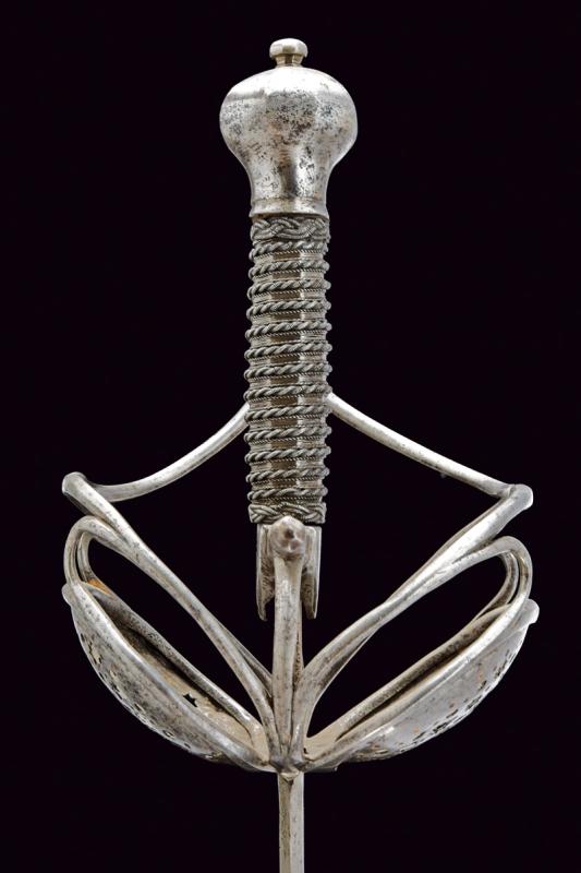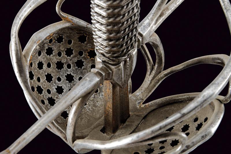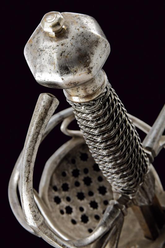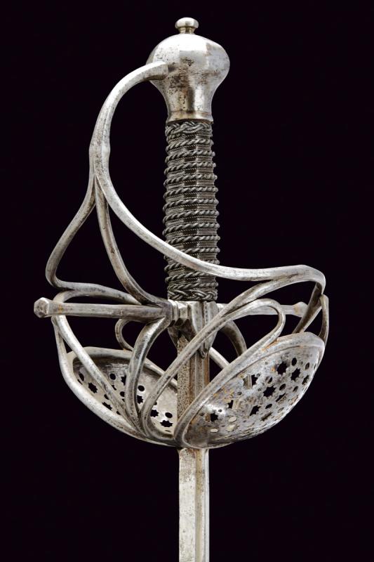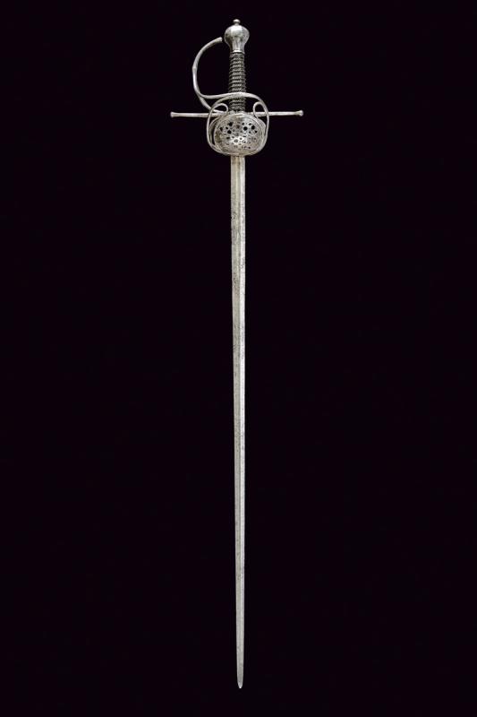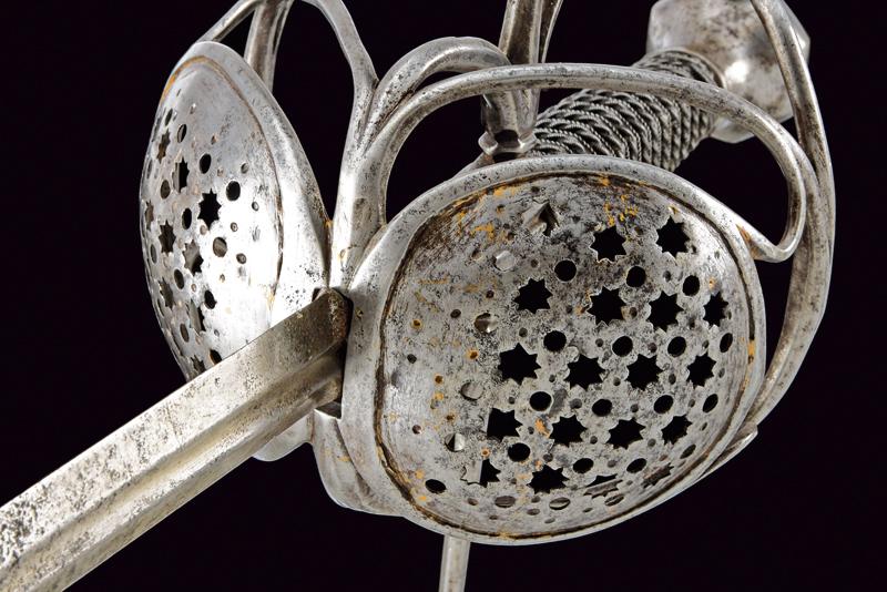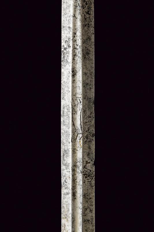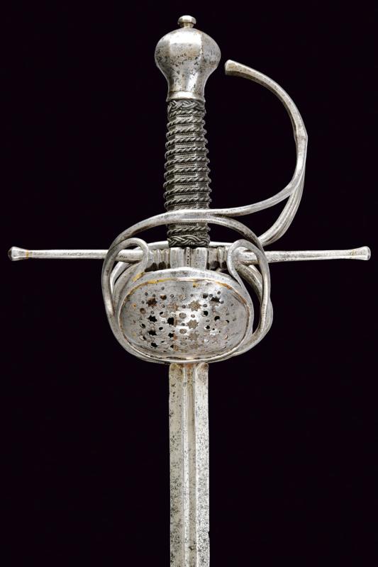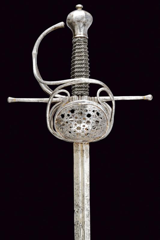 Lama dritta a due fili di sezione esagonale (in buone condoni, qualche segno d'uso e del tempo, in particolare alcune zone con pitting nel primo terzo della spada), la base con sguscio e con lupo di Passau inciso (resti di metallo giallo); ricasso delineato ai bordi. Fornimento in ferro con doppia valva traforata a stelle e cerchi; elso a bracci dritti con estremità ingrossate; massello appuntito con cordonatura centrale intagliata a rilievo su entrambi i lati. Impugnatura in legno rivestita da una bellissima trecciola e dotata di teste di moro in filo di ferro. Pomo in ferro a turbante faccettato; bottone a cuscino.