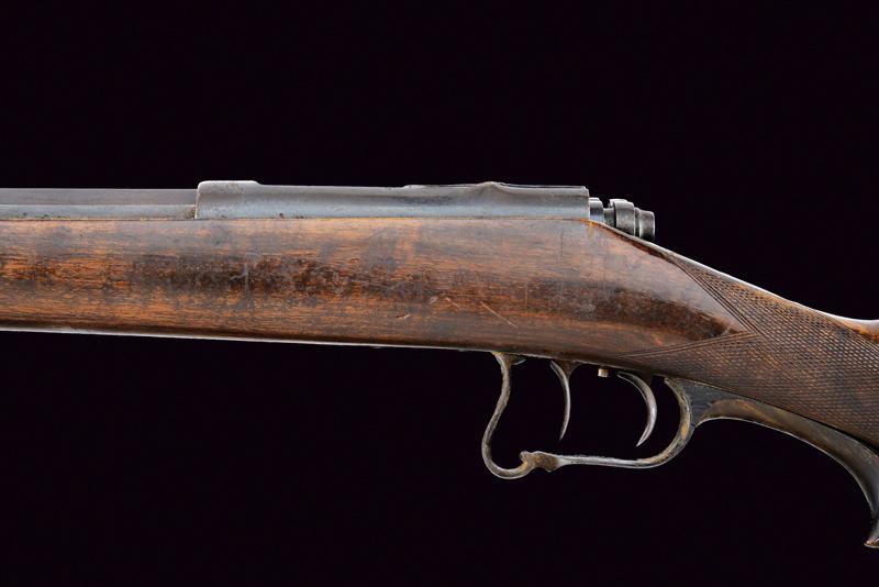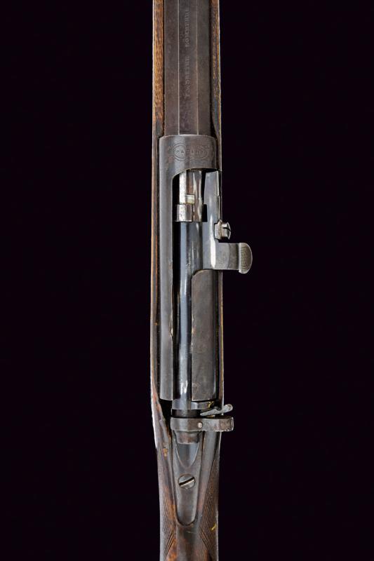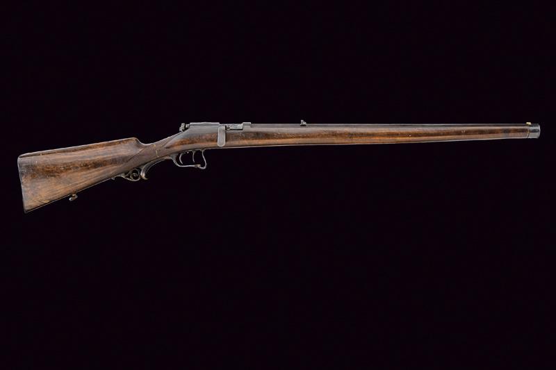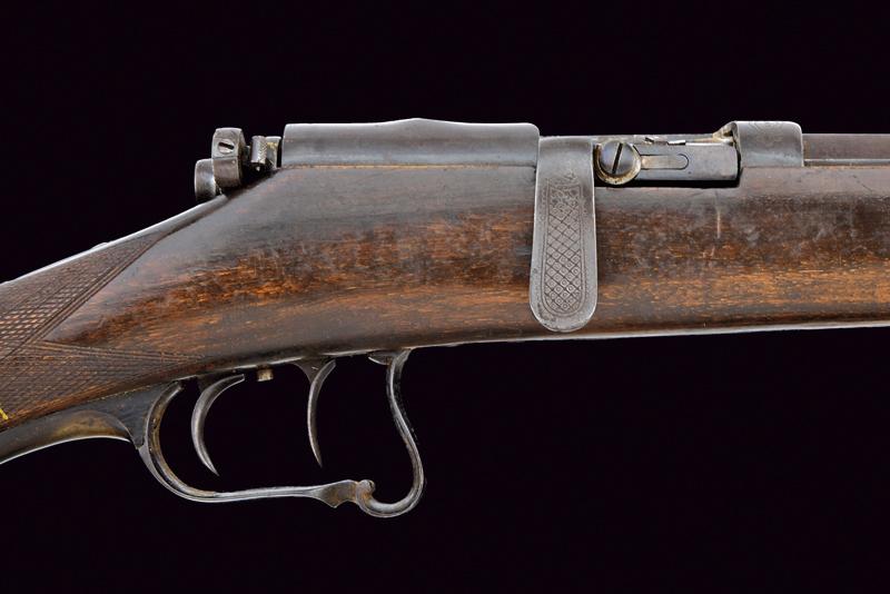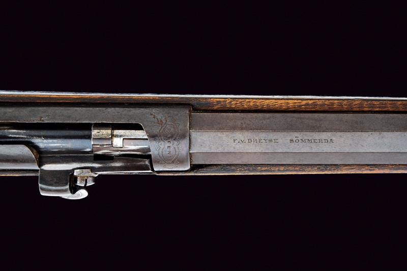Canna ottagonale rigata (anima, parzialmente impolverata, da pulire, rigatura visibile), cal. 10,8 mm. in volata; al dorso marcatura "F.V. DREYSE SÖMMERDA". Mirino e alzo fisso. Otturatore girevole-scorrevole con telaio marcato "PATENT". La leva dell'otturatore con incisione a rete. Meccanica funzionante. Grilletto e stecher funzionanti. Cassa intera in noce con zigrinatura al collo. Fornimenti in ferro. Il ponticello con ricciolo e coda in corno traforato (lieve mancanza). Qualche segno d'uso e del tempo. Resti di brunitura probabilmente antica.